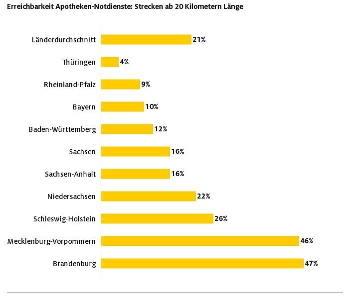 Besonders kritisch waren in der Studie die 21 Prozent, bei denen die Strecke zwischen Wohnort und Apotheke 20 Kilometer oder länger war. Von derartigem Missstand betroffen waren vor allem Menschen in ländlichen Gegenden von Brandenburg und Mecklenburg-Vorpommern: Verteilt auf die Bundesländer zeigte sich, dass die Versorgung in diesen beiden Ländern tatsächlich problematisch ist. Rheinland-Pfalz und Bayern schnitten hier am besten ab.