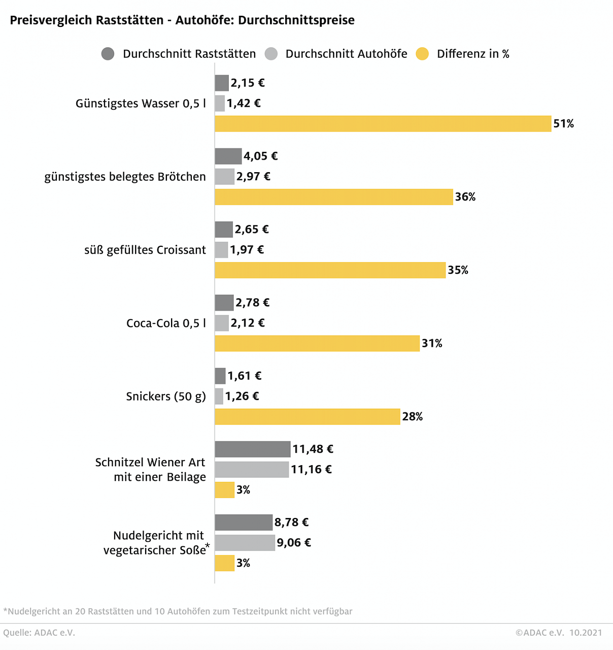 Die 0,5-Liter-Wasserflasche lag beispielsweise 51 Prozent über dem Preis der Autohöfe. Das belegte Brötchen, ein süß gefülltes Croissant und eine Flasche Cola waren im Durchschnitt in der Raststätte ca. ein Drittel teurer. Allerdings muss für die Anfahrt des Autohofes die Autobahn verlassen werden. Betrachtet man die Einzelpreise der Produkte waren die Preisspannen teils enorm.