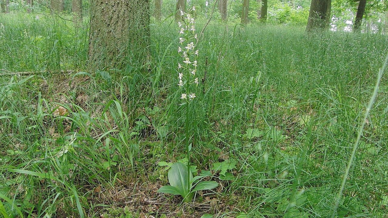 Die in Deutschland gefährdete Orchidee Grünliche Waldhyazinthe (Platanthera chlorantha) ist die vielleicht optisch ansprechendste Art, die wir auf der in diesem Beitrag beschriebenen Mahdfläche erhalten. Die anderen dort siedelnden, meist stärker gefährdeten Arten, sind eher unscheinbar. Die Aufnahme entstand 2013 in den Fahner Höhen bei Eschbergen. (Foto: B. Schwarzberg)