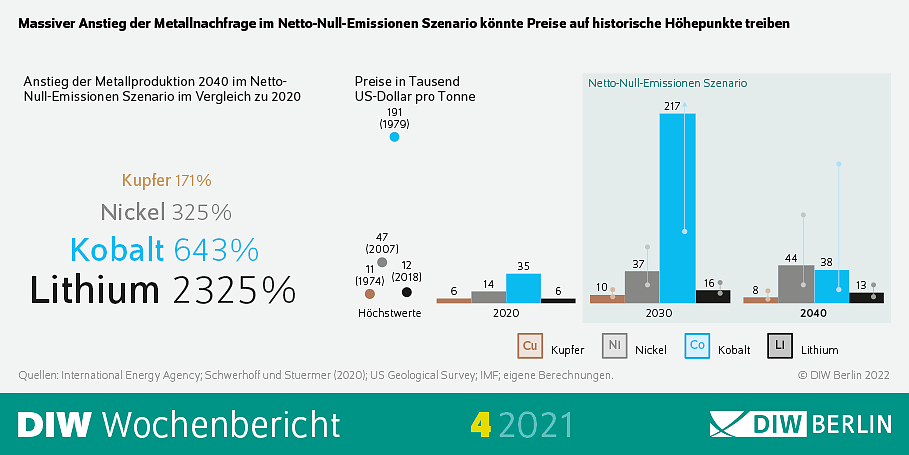 Für den Bau von Windkraft- und Photovoltaik-Anlagen sind große Mengen an Kupfer, für Elektromobilität viel Kobalt, Lithium und Nickel nötig. Die Nachfrage nach diesen Rohstoffen wird in den kommenden Jahrzehnten steil nach oben gehen, so die Annahme in dem untersuchten Szenario, das keine Prognose darstellt. Annahmen der IEA zufolge dürfte sich der jährliche Kupferverbrauch in den kommenden 20 Jahren verdoppeln, der von Nickel mehr als verdreifachen und der von Kobalt versechsfachen. Bei Lithium ist die Steigerungsrate am höchsten: 2040 wird die Nachfrage voraussichtlich mehr als zwanzigmal so hoch sein wie heute. Damit dürfte die Nachfrage bedeutend schneller wachsen als die anderer für die Energiewende notwendiger Metalle.
