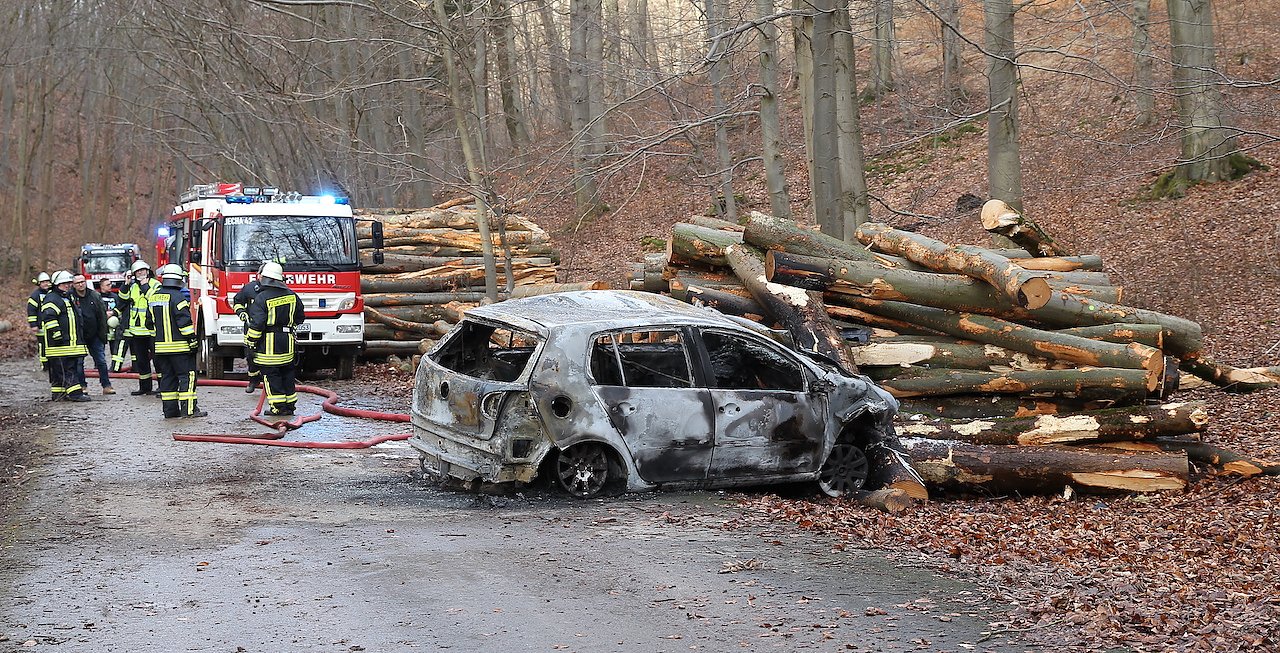 Kurz nach 14 Uhr ging der Anruf des Zeugen auf der Polizeidiensstelle ein. Er berichtete von einem brennenden Auto auf einem Feldweg zwischen Sondershausen und Westerengel. Das Fahrzeug, ein VW Golf, kollidierte aus bislang noch ungeklärter Ursache auf dem nicht als öffentliche Straße augewiesenem Weg mit einem Stapel Baumstämme. Der Golf ging dabei in Flammen auf und brannte vollständig aus.