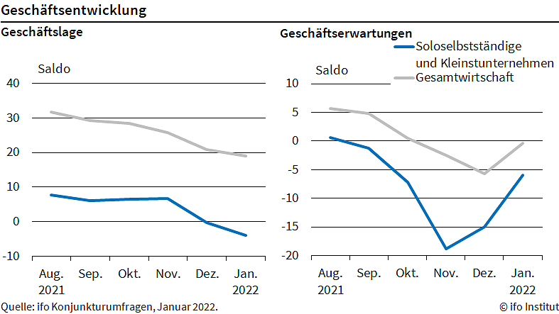 Die Verbesserung des Geschäftsklimas war insbesondere auf deutlich weniger pessimistische Erwartungen zurückzuführen. Die aktuelle Lage wurde hingegen nochmals schlechter eingeschätzt. 26 Prozent der Kleinstunternehmen und Soloselbständigen fürchten gegenwärtig um ihre Existenz. Im Dezember lag der Wert noch bei 24,9 Prozent. In der gesamten Wirtschaft berichteten 13,7 Prozent von Existenzsorgen.