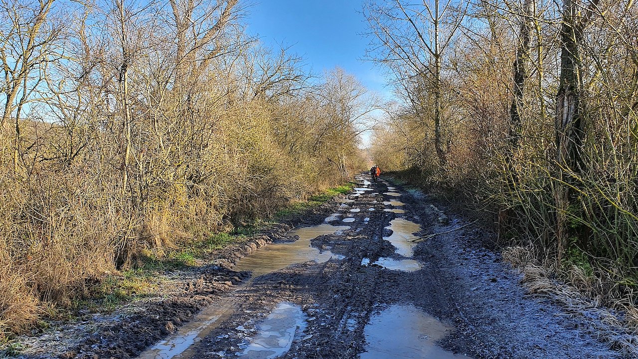 Ein glücklicherweise nicht asphaltierter Weg zwischen Langenbogen und Köllme (etwa km 90): Schlamm und Pfützen auch außerhalb des Alten Stolbergs waren Markenzeichen des 41. Südharz-Hunderters. (Foto: B.Schwarzberg)