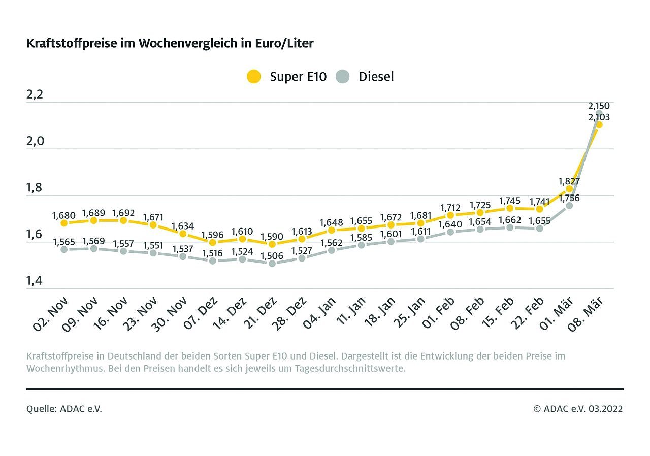 Der Anstieg der Spritpreise ist auch auf die Entwicklungen am Rohölmarkt zurückzuführen, der aufgrund des Krieges in der Ukraine in Aufruhr geraten ist. Seit der Vorwoche hat sich Rohöl der Nordseesorte Brent um über 20 US-Dollar verteuert – den heute registrierten explosionsartigen Anstieg der Kraftstoffpreise rechtfertigt dies nach Ansicht des ADAC jedoch nicht. Damit hat sich der Benzinpreis vom Rohölpreis und Dollar-Kurs entkoppelt.