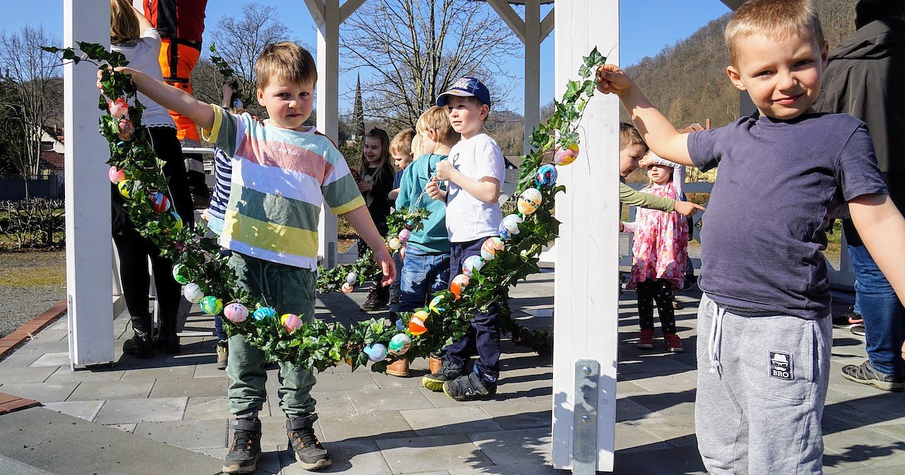 Die Mädchen und Jungen der Ilfelder Kita Rappelkiste haben in den vergangenen Tagen kräftig mitgeholfen, 350 Plastikeier zu marmorieren. Ein Teil der Eier wurde am Mittwochnachmittag, hübsch gebunden mit Efeu, am neuen Pavillon im Ilfelder Kurpark aufgehängt...