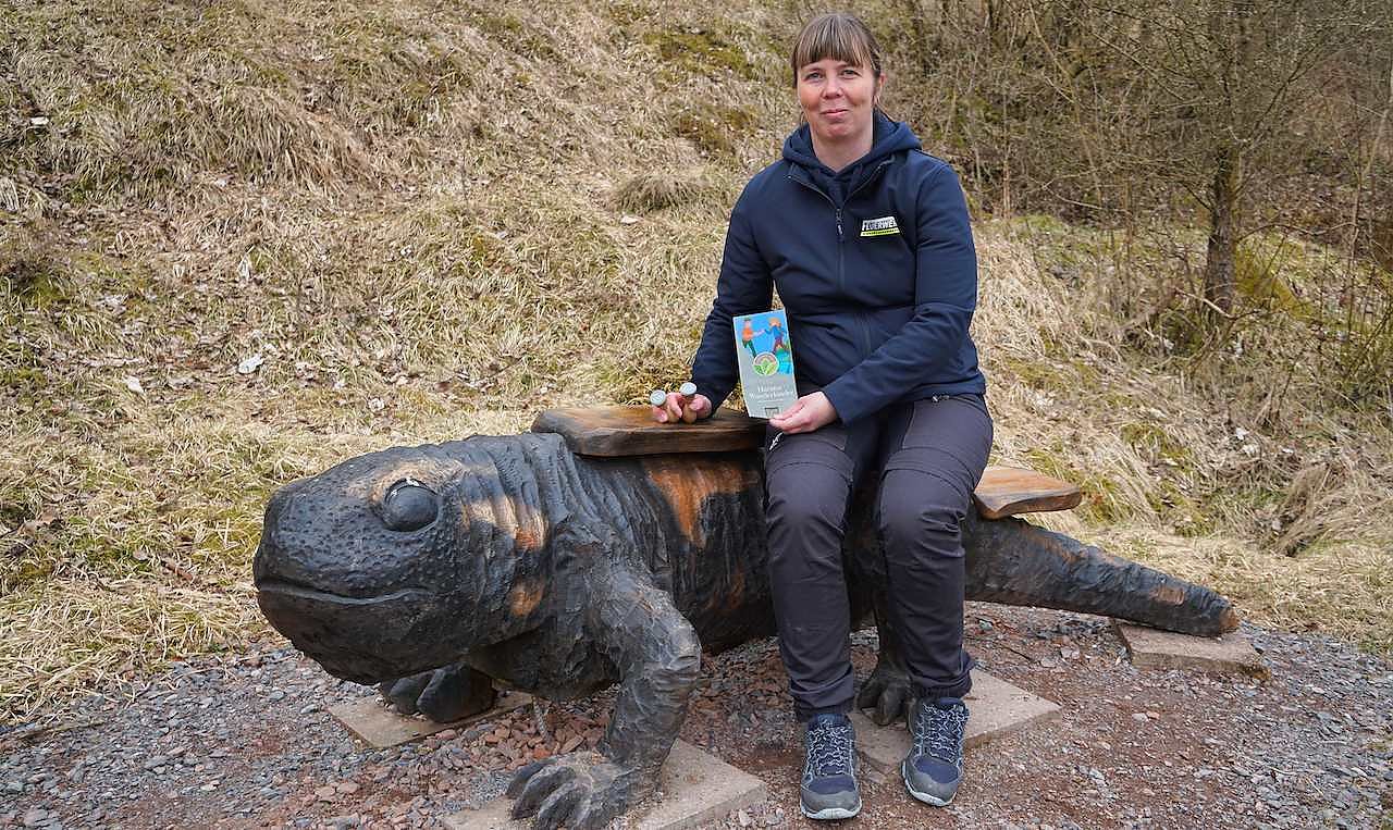 Foto: Jugendwartin Gabriele Knust auf der Feuersalamanderbank in Niedersachswerfen, an der einer der 31 Stempelkästen aufgestellt werden soll. Sie präsentiert Stempel und Flyer des Projektes. Foto: Susanne Schedwill