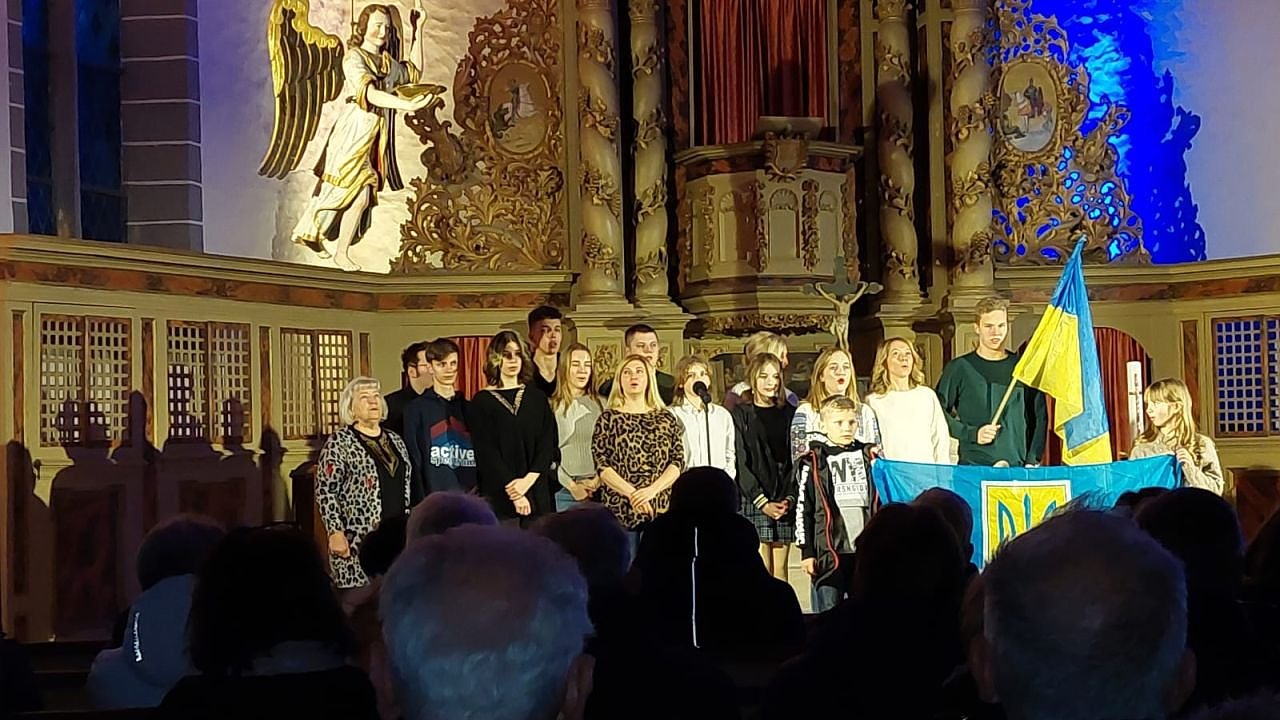 Die ukrainischen Flüchtlinge bei ihrem kurzen Auftritt des Dankes in der Neustädter Kirche