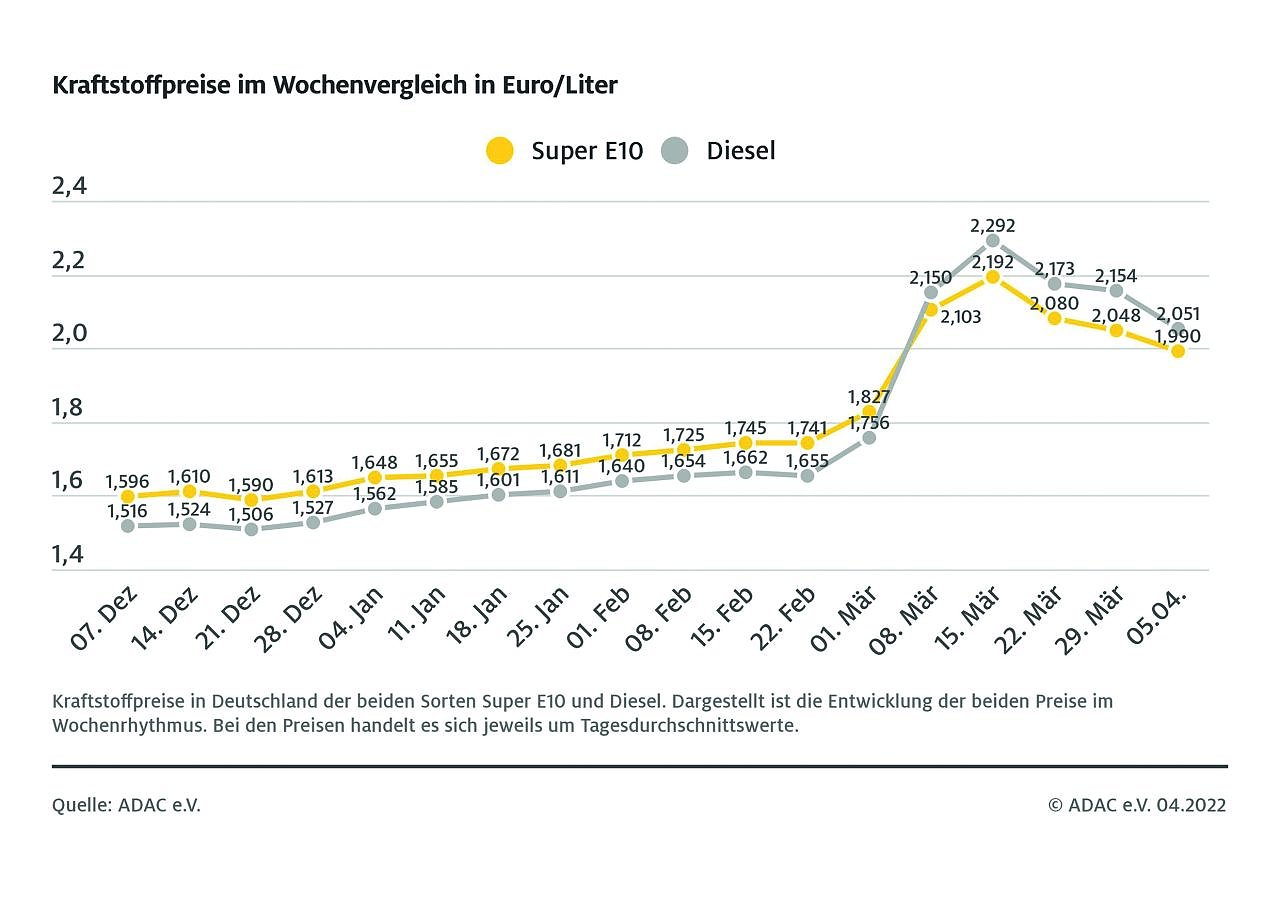 Nach Angaben des ADAC sind die Kraftstoffpreise – unter anderem durch die Auswirkungen des Ukraine-Krieges – weiter deutlich überhöht. Dies zeigt der Vergleich mit dem 1. März. Damals waren die Rohölnotierungen für Brent-Öl auf ähnlich hohem Niveau wie heute, ebenso der Euro-Dollar-Kurs. Super E10 kostete vor fünf Wochen jedoch 16,3 Cent je Liter weniger, Diesel war sogar 29,5 Cent je Liter billiger. Der ADAC verweist vor diesem Hintergrund darauf, dass weiterhin sehr deutliches Potenzial für ein Abschmelzen der Tankstellenpreise vorliegt. Der aktuelle Rückgang muss somit weitergehen.