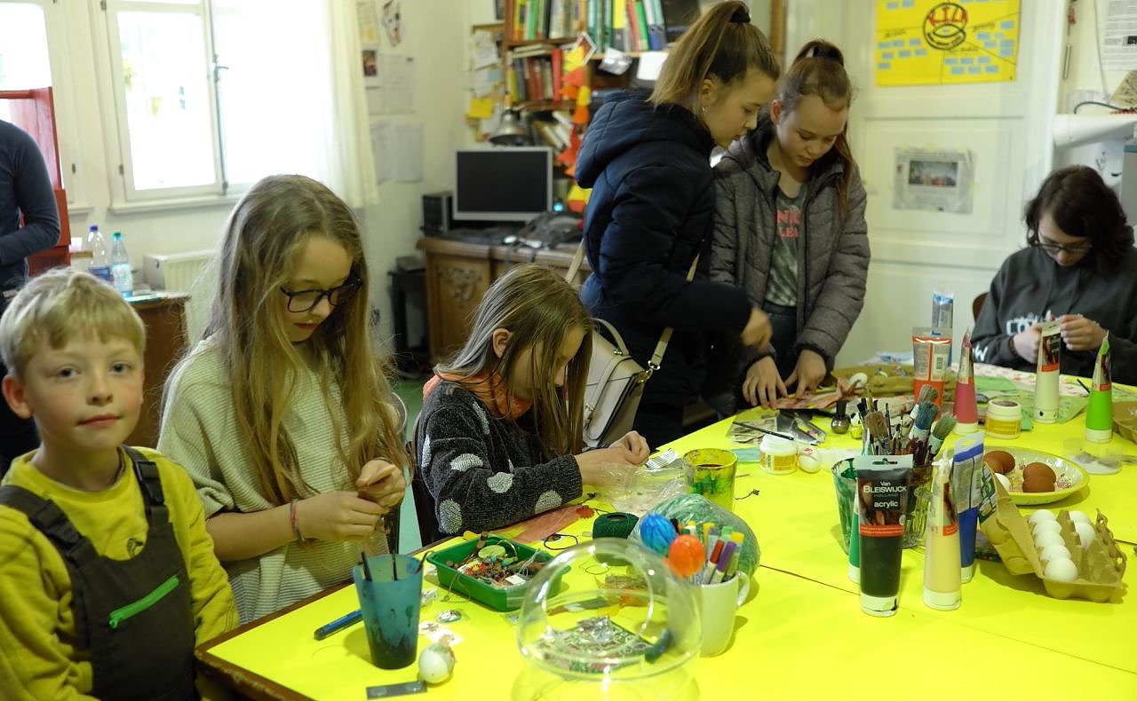Unter anderem geht es dabei auch ums Ostereier einfärben. Viele bunte Lebensmittel - Farben stehen dann bereit, um die Eier in einer Farblösung einzutauchen. Vorher können die Eier mit flüssigem Kerzenwachs verziert werden und diese behandelten Stellen bleiben dann beim Färben weiß bzw. in der Naturfarbe der Eier.