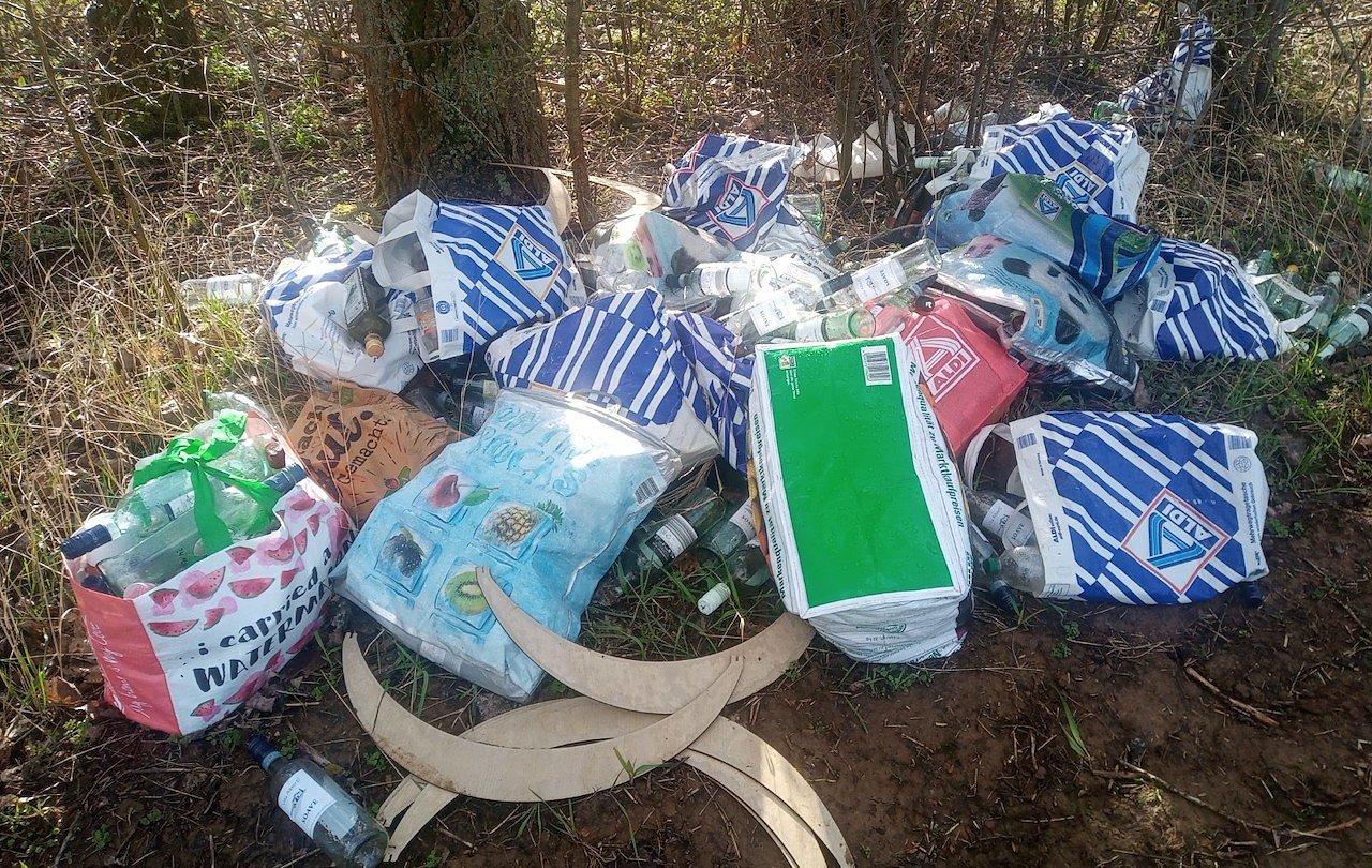 Auf dem besagten Feldweg wurden 10-12 große Einkaufstaschen entsorgt, gefüllt mit hauptsächlich leeren Weinflaschen. Einige leere Öl- und Schnapsflaschen sind auch darunter.