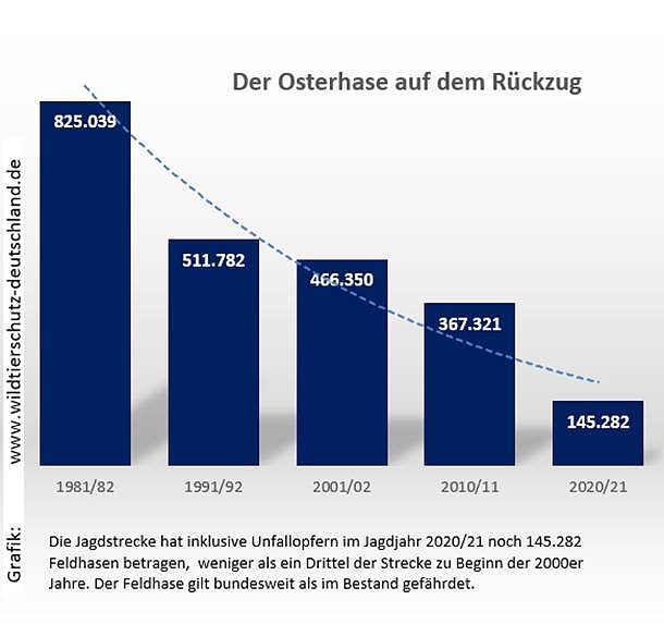 Bundesweit gilt der Feldhase gem. der aktuellen Roten Liste der gefährdeten Tierarten als im Bestand gefährdet. Die Jagdverbände betonen zwar unermüdlich, dass sie den Feldhasen, dort wo er ihnen gefährdet erscheint, jagdlich schonen. Tatsache ist aber, dass nach wie vor weit über 100.000 dieser Tiere – und das sind dann die, die sich reproduzieren könnten – erschossen werden.