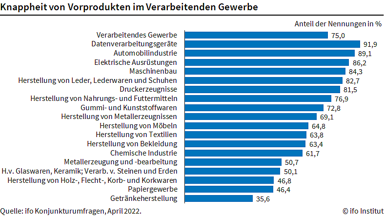 Die Hersteller von Datenverarbeitungsgeräten sind mit 91,9 Prozent am stärksten betroffen vom Materialmangel. Auch in der Autoindustrie ist der Anteil mit 89,1 Prozent sehr hoch. Bei den Herstellern von Nahrungsmitteln ist der Anteil auf rund drei Viertel gestiegen. In der Chemischen Industrie ist der Anteil hingegen auf 61,7 Prozent gesunken, von 70,5 im März. Im Moment gibt es keine Anzeichen, dass es in den kommenden Monaten zu einer substantiellen Entlastung kommt, ergänzt Wohlrabe.