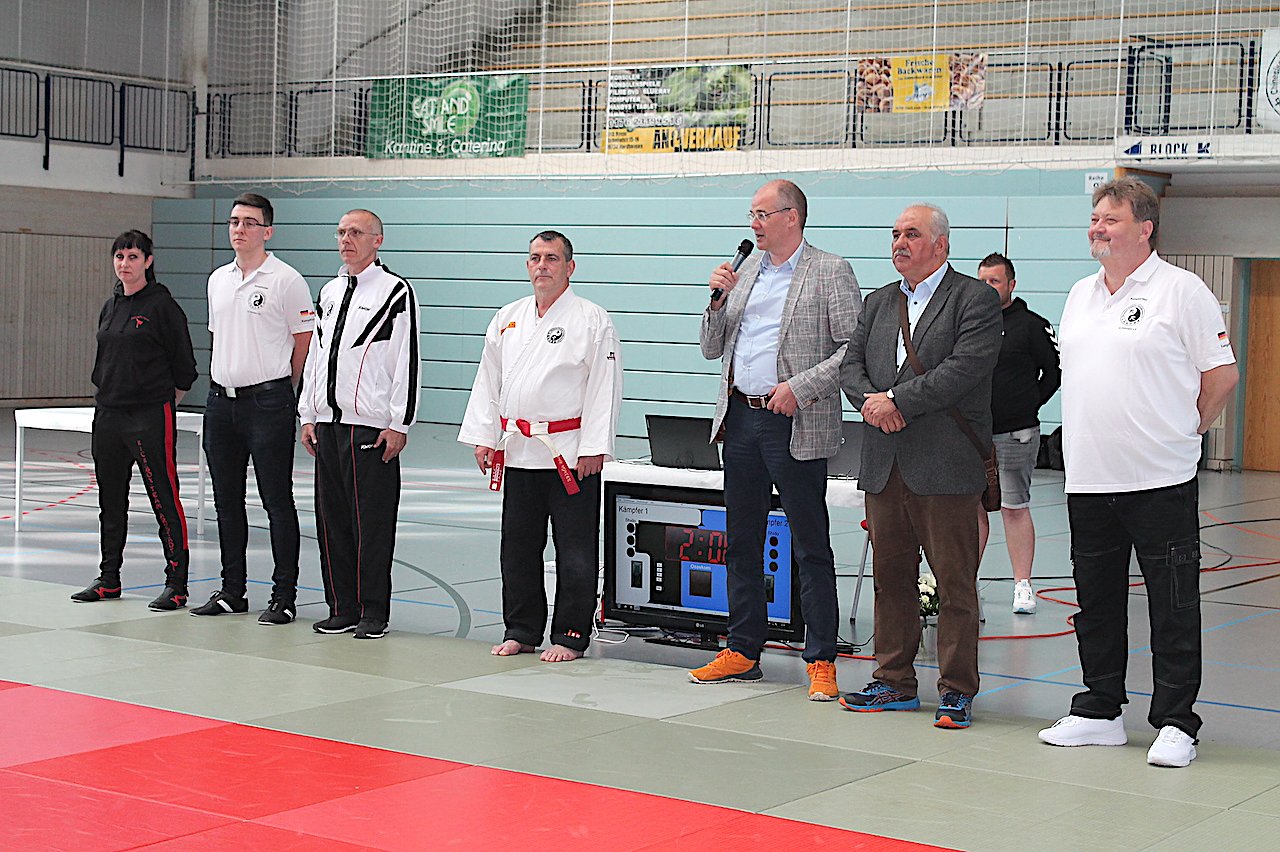 Der Landrat Matthias Jendricke, an seiner Seite Kreissportkoordinator Werner Hütcher und der Präsident des CDK- Thüringen Werner Bank eröffneten die gut organisierte Meisterschaft. Gleichzeitig ehrten sie den Vorsitzenden der Sport & Kampfkunstakademie Nordhausen, Thomas Köhler, für sein 50-jähriges Mattenjubiläum und seine Verdienste im Verein und Verband (CDK – Thüringen) mit dem 7. Dan.