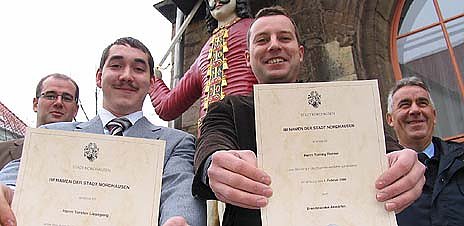 Nordhausen (nnz). Ohne Urkunde sind Sie nichts – und mit Urkunde alles. Das ist im Beamtenrecht so, mit diesen Worten hat heute Morgen Nordhausens Bürgermeister Matthias Jendricke (SPD) für klare Fronten bei zwei jungen Männern gesorgt.