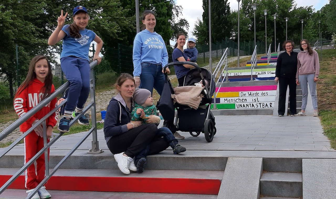 Über das Bundesprogramm Demokratie leben! – Aktiv gegen Rechtsextremismus, Gewalt und Menschenfeindlichkeit konnten Fördermittel für die Farben beschafft werden. In der vergangenen Woche wurden die ersten Stufen mit Unterstützung ukrainischer Kinder und Frauen bemalt und beschriftet.