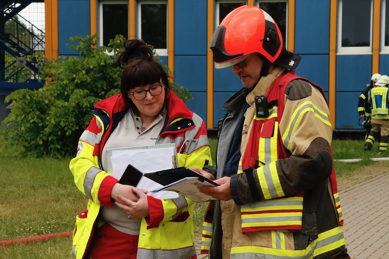 Am Ende sind sowohl die Beobachter sowohl auf Seiten der Feuerwehr wie auch auf der Seite des Rettungsdienstes zufrieden. Für das zweite Lehrjahr war das sehr, sehr gut. Sie haben vorausschauend gehandelt, ein Inhalationstrauma erkannt, die richtige Zielklinik gewählt und sehr schön strukturiert gehandelt, lobt Praxisanleiterin Mertens. Auch Wachabteilungsleiter Nolte hat ein genaues Auge auf die Abläufe geworfen und bis kurz vor Ende lief alles wie geplant. Exakt 43 Minuten nach Alarmierung waren alle Verletzten lokalisiert, geborgen und versorgt.