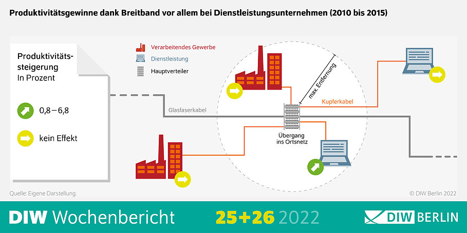 Das zeigt eine aktuelle Studie der Abteilung Unternehmen und Märkte im Deutschen Institut für Wirtschaftsforschung (DIW Berlin). Einige Dienstleistungsunternehmen, beispielsweise in der Luft- und Schifffahrt, im Bereich Film und TV, in der Datenverarbeitung und Werbung, konnten schnellere Internetverbindungen zu ihrem Vorteil nutzen sie arbeiteten fortan dank des Breitbandausbaus um rund ein bis zu knapp sieben Prozent produktiver als zuvor. Industrieunternehmen des verarbeitenden Gewerbes, also beispielsweise Chemie- und Pharmakonzerne sowie Maschinen- und Fahrzeugbauer, hatten jedoch nichts vom schnelleren Internet.