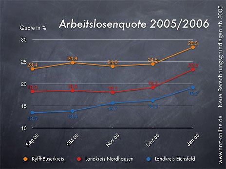 Die Arbeitslosigkeit ist im Januar um 1.599 auf 11.854 gestiegen. Im Vergleich zum Vorjahr gab es 481 Arbeitslose weniger. Die Arbeitslosenquote, berechnet auf der Basis aller zivilen Erwerbspersonen, betrug im Januar 26,0 %. Vor einem Jahr hatte sich die Quote auf 26,9 % belaufen. In der Geschäftsstelle Sondershausen waren im Januar 313 Stellenangebote registriert, gegenüber Dezember ist das ein Rückgang von 18. Im Vergleich zum Vorjahr gab es 162 Stellen mehr.