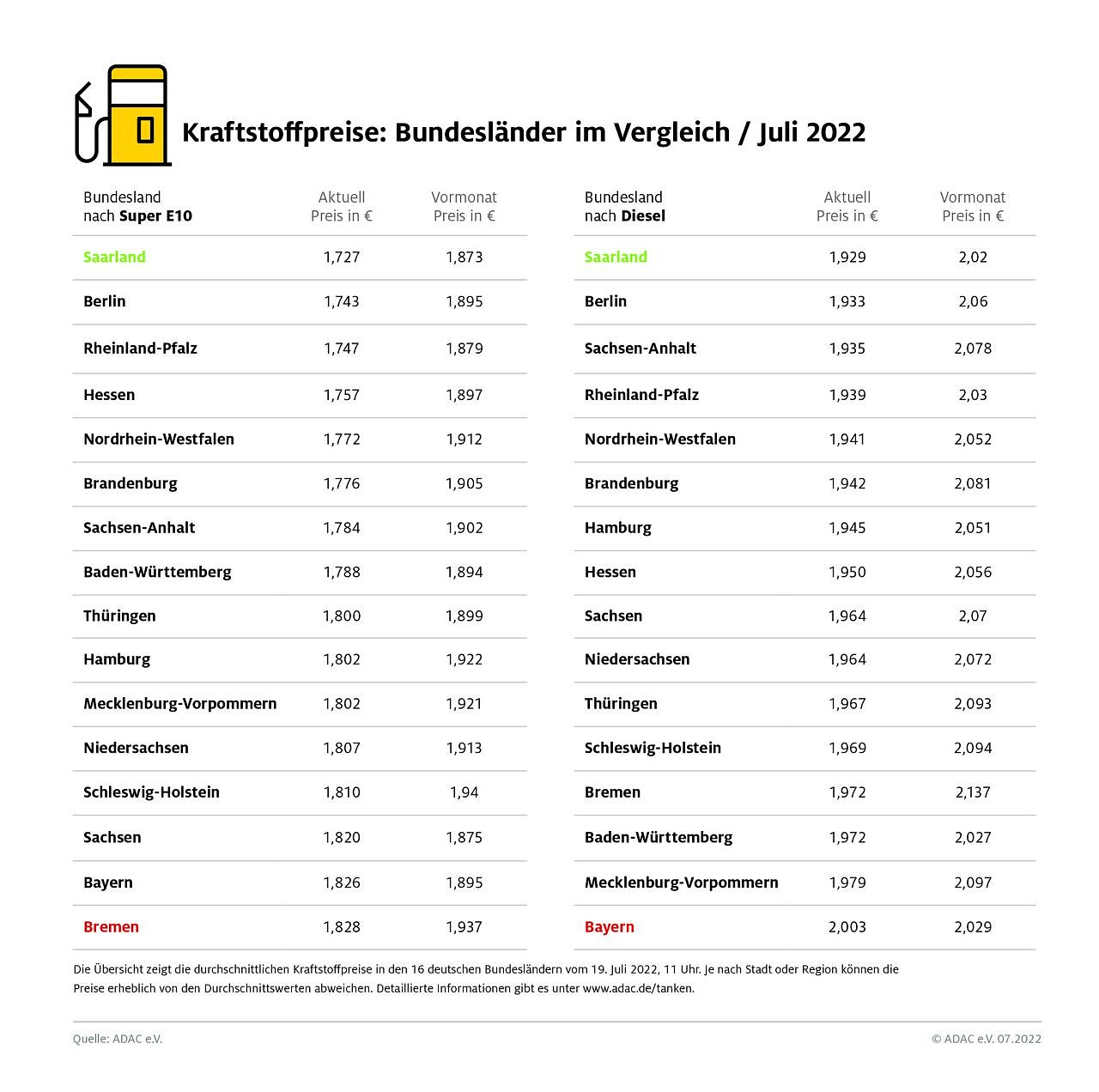Wie die aktuelle ADAC Auswertung der Kraftstoffpreise in den 16 Bundesländern zeigt, kostet ein Liter Super E10 in Bremen mit 1,828 Euro am meisten, dicht gefolgt von Bayern mit einem Durchschnittspreis von 1,826 Euro. Am preiswertesten ist Benzin im Saarland: Hier muss man für einen Liter Super E10 1,727 Euro bezahlen, das sind 10,1 Cent weniger als in Bremen.