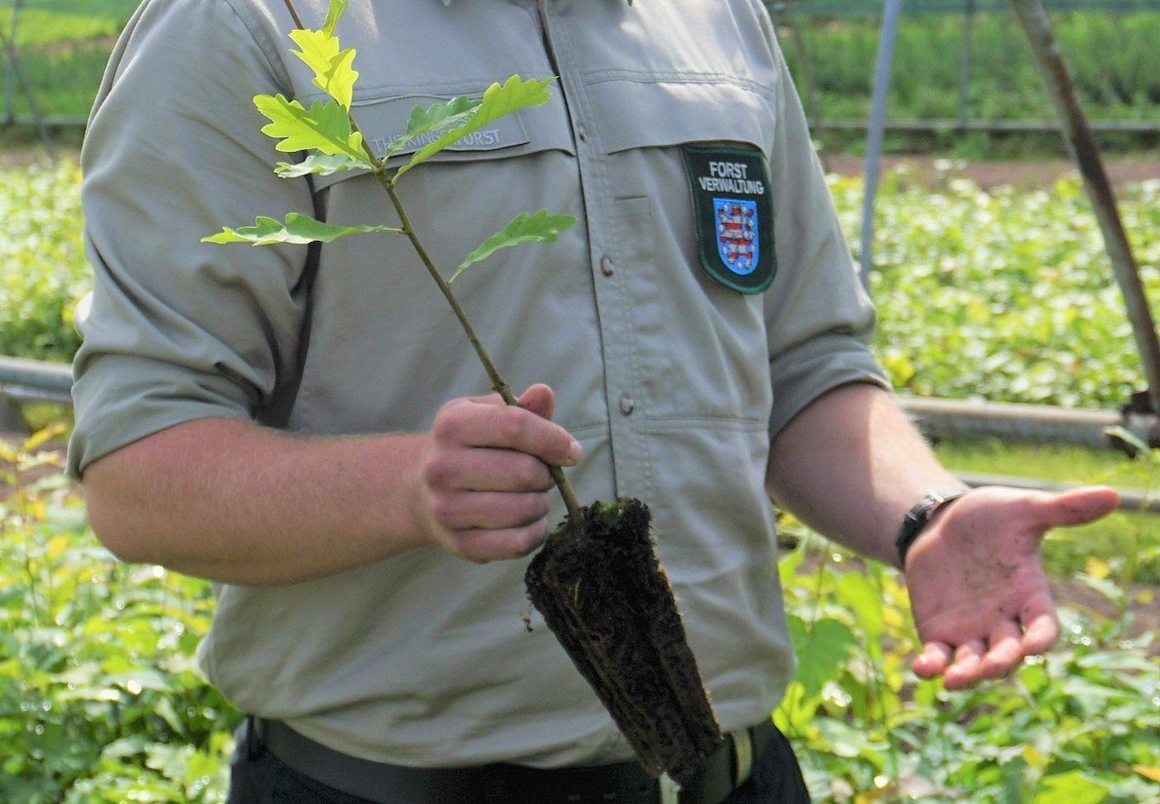 Praxisforschung bei ThüringenForst: Forstkulturen sollen verstärkt mit wurzeloptimierten Pflanzen, wie hier eine Eichen-Containerpflanze, an die klimawandelbedingten Dürrephasen angepasst werden (Foto: Dr. Horst Sproßmann)