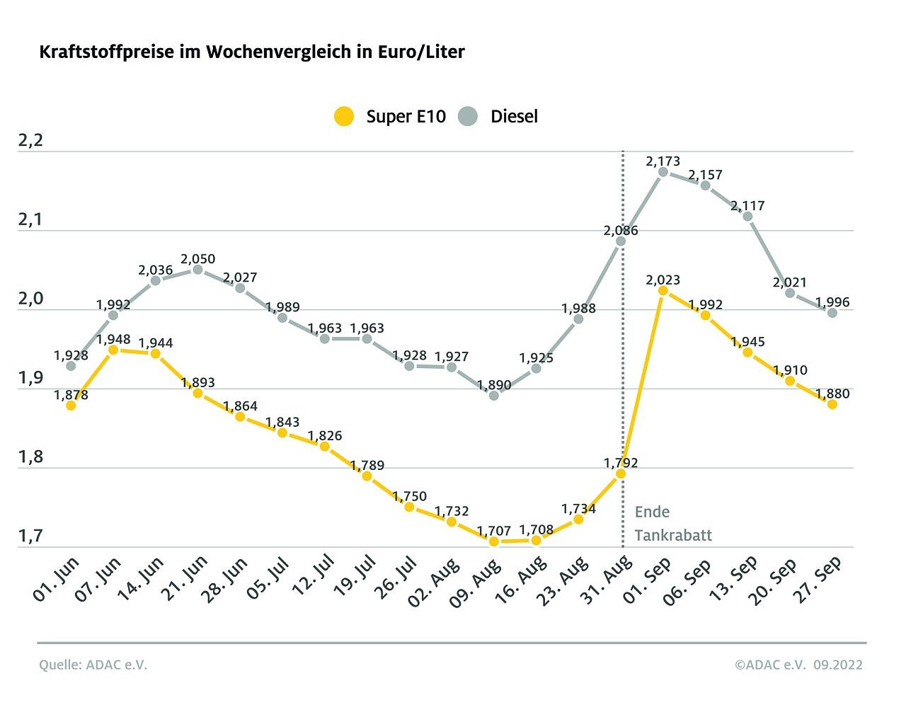 Zuletzt lag der Diesel-Preis am 23. August mit 1,988 Euro je Liter unter der Zwei-Euro-Marke, damals aber noch unter den Bedingungen des Tankrabatts mit einem steuerlichen Abschlag von rund 17 Cent. Der Tankrabatt wurde planmäßig am 31. August beendet.