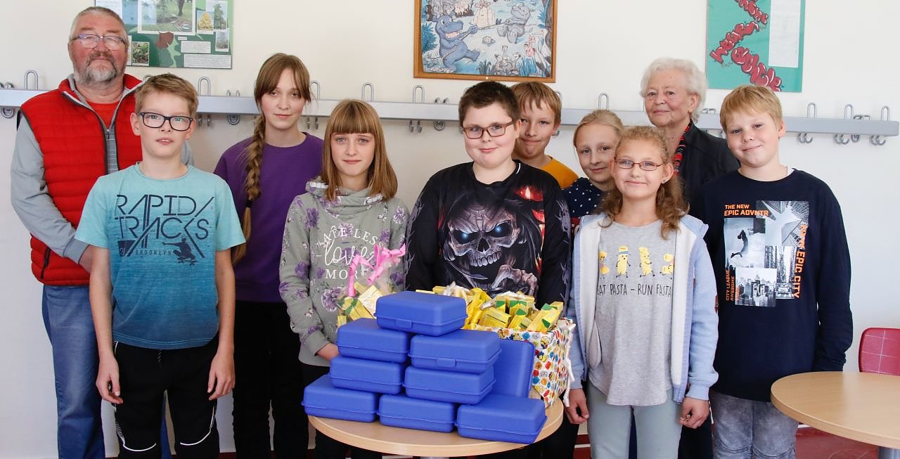 Insgesamt 105 Brotbüchsen, die man selber aus einer Spende erhalten hatte, wurden heute von Helga Rathnau und Jürgen Spangenberg an die Schülersprecher der Klassen zwei bis sechs des Förderzentrums Pestalozzi übergeben (Foto: agl)
