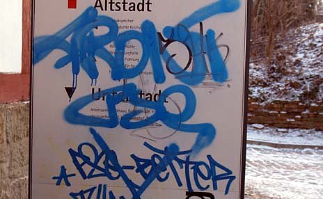 nnz-Leser Marco Schmirge hatte diese einstige Informationsstele an der Finkenburg entdeckt. Und irgendwie gibt es für ihn Parallelen in Form und Farbe zu den Schmierereien am Alten Friedhof in Nordhausen, über die nnz gestern berichtete.