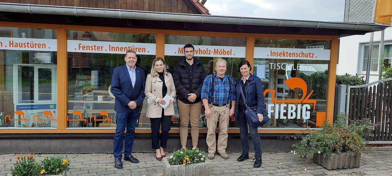 Marc Weinrich (Kreishandwerkerschaft) Romina Kali, Antonio Shabani (beide aus Shkodra/Albanien) Uwe Fiebig (Tischlermeister) Sylvia Daehn (ESN) (Foto: Europaservice Nordthüringen)