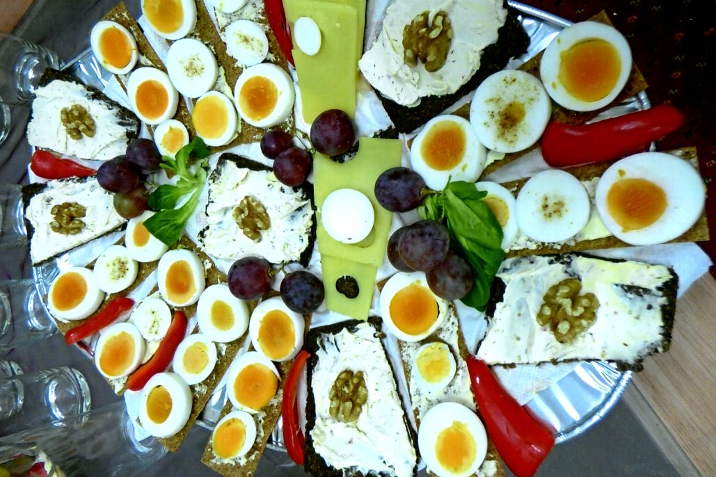 Da wir eine experimentierfreudige Meisterin der Essenszubereitung, Heinke Richter, in unseren Reihen haben, die in ihrem Bücherschrank auch eine Sammlung von Kochbüchern ihr eigen nennt, die ihr Inspirationsquelle für ihre Kochgenialität sind, beauftragten wir sie, für uns und unsere Gäste eine abwechslungsreiche Kost für Geist und Gaumen zusammenzustellen.