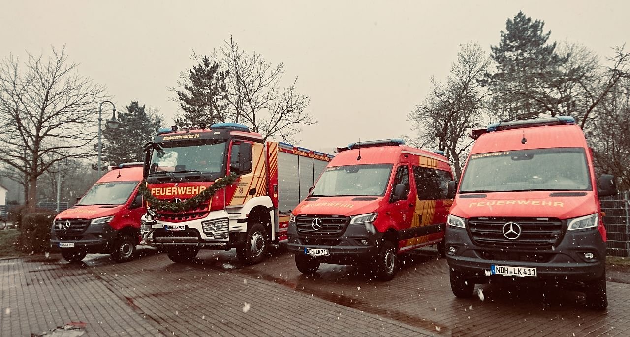Schön aufgereiht und geschmückt wurden vor der Stützpunktfeuerwehr in Niedersachswerfen heute Nachmittag drei neue Einsatzleitfahrzeuge und ein Tanklöschfahrzeug übergeben. Das freudige Ereignis eröffnete Harztor Bürgermeister Stephan Klante, die Lage habe sich in den letzten Jahren geändert, Stichwort Waldbrand, das neue Gerät komme also zur rechten Zeit.