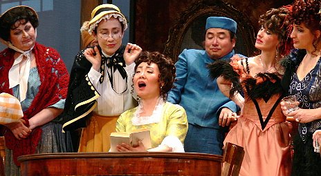 Nein, die Geschichte spielt 1869 in Tumbleweed, einem verschlafenen Kaff in Arizona, dicht an der mexikanischen Grenze. Im Saloon The Drunken Turkey (wunderbares, weil witziges und detailverliebtes Bühnenbild von Tom Presting) treffen die Heldin Adina (Jung-A Lee), ihre Freundinnen Gianetta (Anja Daniela Wagner als hitzige Mexikanerin) und Kitty (Sigrid Herforth brilliert als lebenserfahrene, zigarrerauchende irische Puffmutter) auf die Männer.