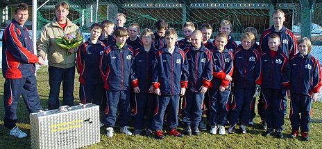 Dieser Tage überreichte Thomas Hesse, der einen Heimlieferservice für Tiernahrung in Niedersachswerfen betreibt, den Wacker-Bubis einen funkenden Aluminiumkoffer zum Transport der Mannschaftsbekleidung. Die D-Junioren waren angetreten, um sich mit einem Blumenstrauß bei Herrn Hesse zu bedanken.