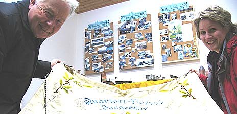 Ortsbürgermeisterin Angela Breuer und der langjährige Dorfpfarrer - und ehemalige Superintendent - Christoph Lerchner - mit der Fahne des Quartett-Gesangsvereines, der nicht nur von 1926 bis 1930 im Ort existierte.