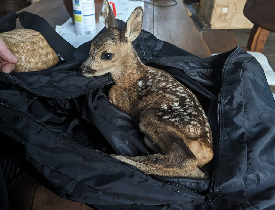 Das kleine Rehkitz wurde an der A38 bei Nordhausen entdeckt (Foto: Landespolizeiinspektion Nordhausen)