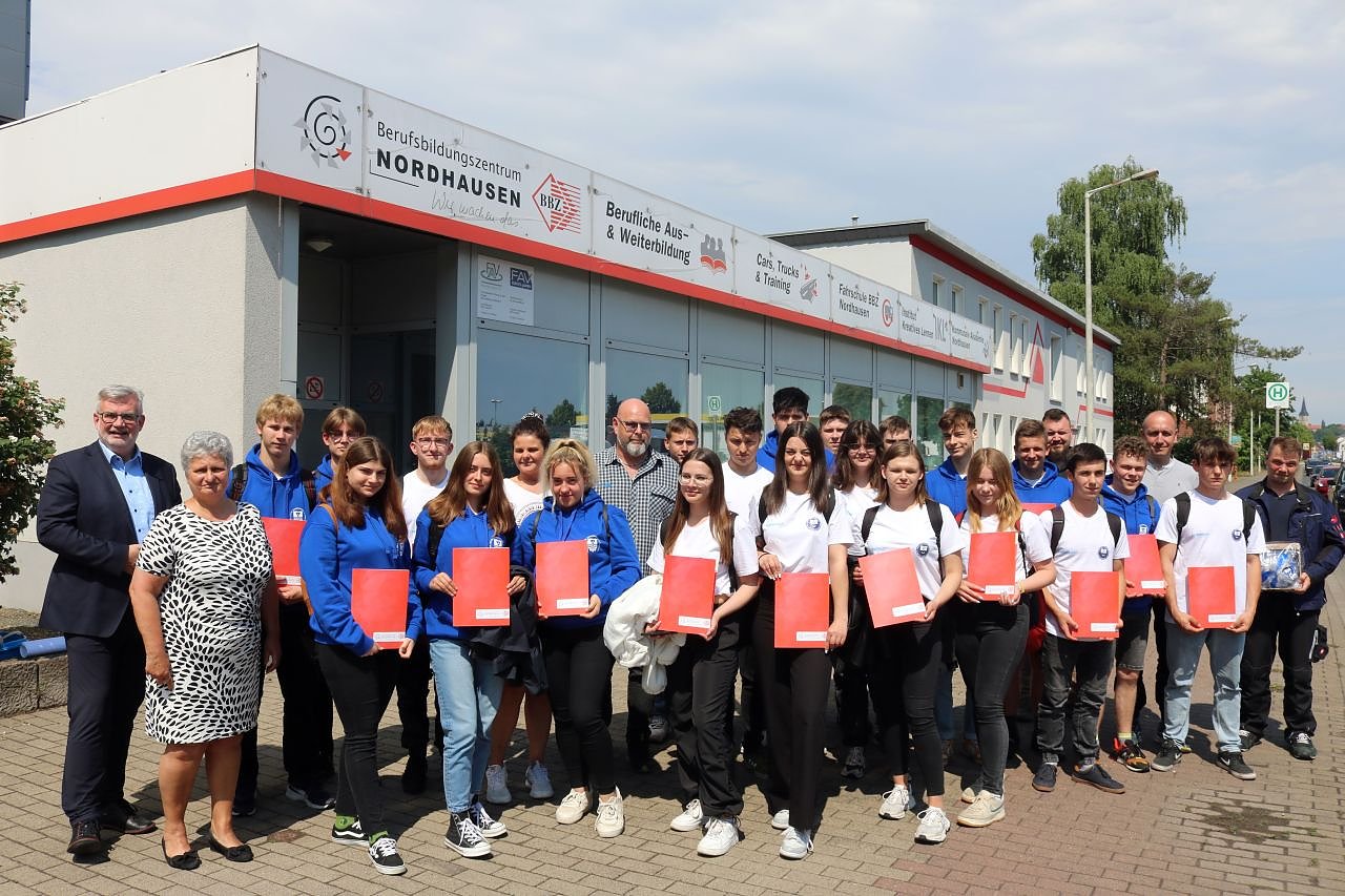 In der zweiten Woche waren die polnischen Gäste in Großbetrieben der Region zur dualen Berufsausbildung zum Mechatroniker und Logistiker eingesetzt, um Erfahrungen in der Ausbildung in Deutschland zu sammeln. Wir bedanken uns bei den beteiligten Unternehmen, wie Schachtbau Nordhausen, Verkehrsbetriebe Nordhausen, Kielholz & Rybicki, AHN Biotechnologie und TRICOR Packaging Systems, für ihre Bereitschaft, dieses Projekt im Rahmen des Austauschs von Jugendlichen im europäischen Raum (ErasmusPlus) zu unterstützen sowie beim EuropaService Nordthüringen für die Unterstützung bei der Organisation und Durchführung, so Olaf Salomon, Geschäftsführer des Berufsbildungszentrums Nordhausen.