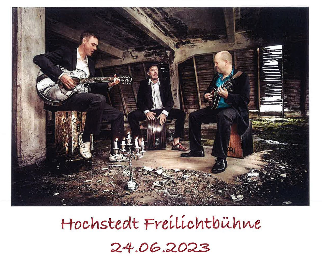 Am kommenden Samstag werden Jens Schilling (Gesang&Gitarre), Jens Wackerhagen (Drums, Melodica, Mundharmonika &Gesang) und Holger Cieslar (Bass, Gitarre, Mandoline, Ukulele & Gesang) auf der Freilichtbühne in Hochstedt ein Konzert geben, bei dem natürlich auch getanzt werden darf. Auf keinen Fall soll es ein Sitzkonzert werden! Es wird eine kleine Tanzfläche geben und das Publikum soll sich bei lockerer Atmosphäre auf dem Gelände der Bühne einfach nur wohl fühlen.