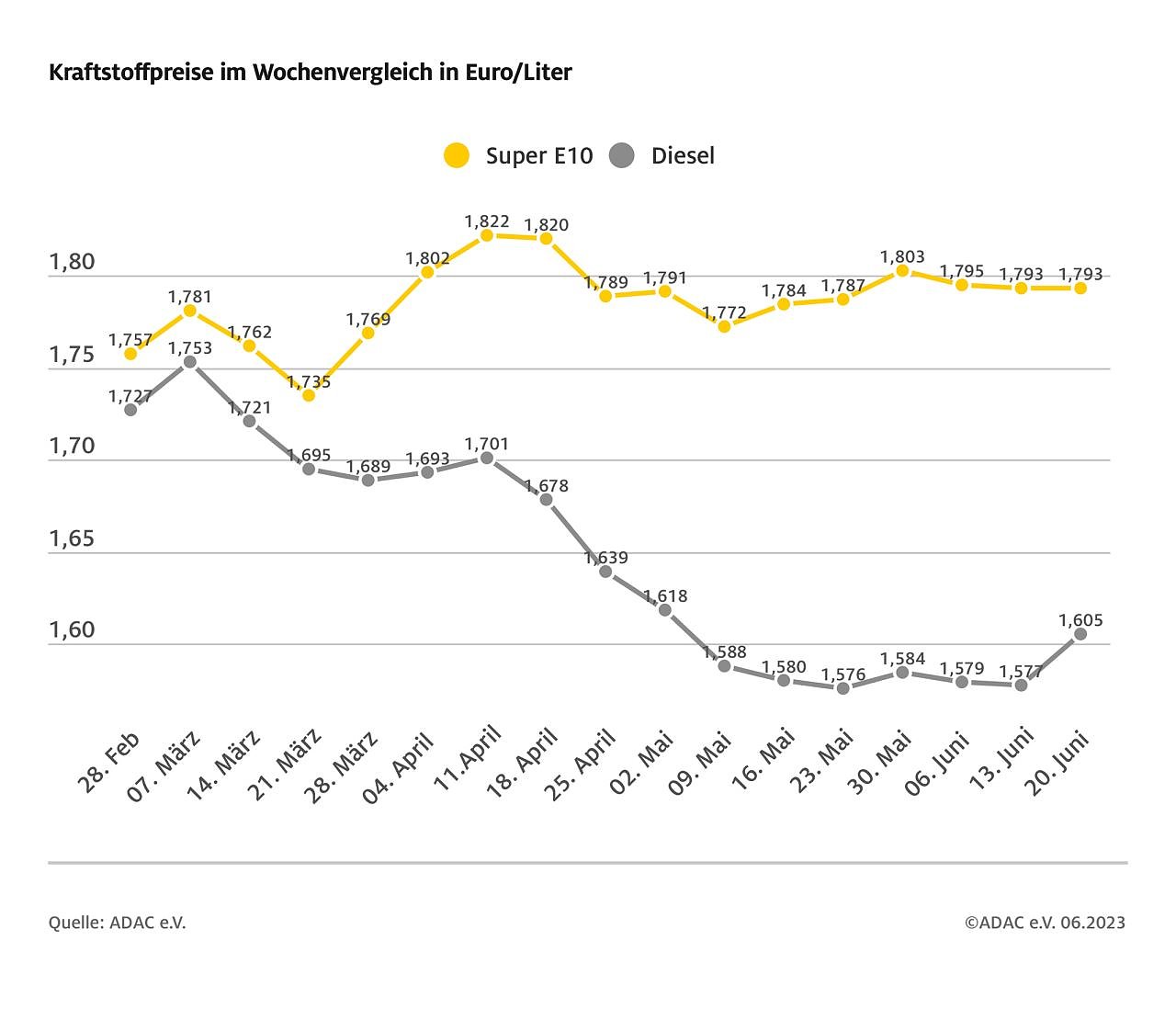 Diesel hat sich binnen Wochenfrist um 2,8 Cent verteuert und kostet derzeit 1,605 Euro je Liter. Der deutliche Preisanstieg bei Diesel ist laut ADAC ungewöhnlich und kann nicht durch die Rohölnotierungen begründet werden.