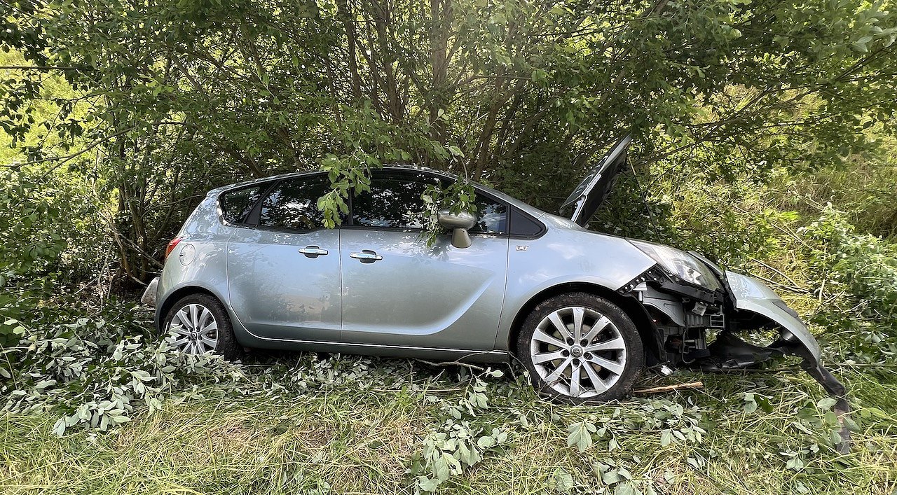 Glücklicherweise verfehlte er den Beginn der Schutzplanke und so fuhr das Auto zirka 150 Meter durch den Graben. Die Fahrt endete in einer Baumgruppe an einem Wasserdurchlass.