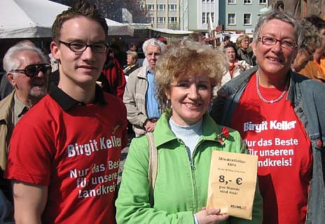 Nordhausen (nnz). Die Landratskandidatin der Linkspartei.PDS, Birgit Keller, eröffnete gestern im Landkreis Nordhausen die am Wochenende vom 10. Bundesparteitag ihrer Partei beschlossene Kampagne zum Thema Mindestlohn. Und dabei wurde gut gefüllte Lohntüten verteilt.