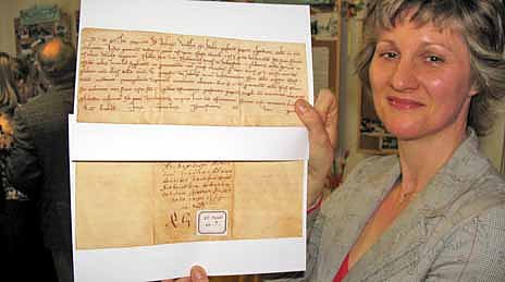 Ortsbürgermeisterin Angela Breuer mit einer Kopie der Urkunde der Ersterwähnung Hesserodes.