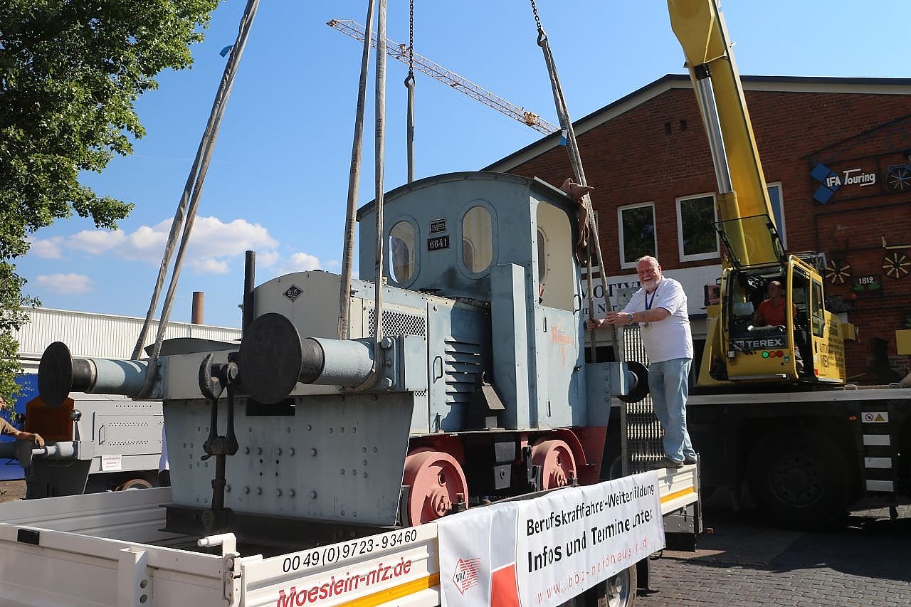 Weiter wäre ich nicht mehr gekommen, allein die Lok in dem Zustand zu halten wäre schwer gewesen, von der Aufarbeitung ganz zu schweigen. Aber ich wollte immer, dass sie auch zu sehen ist, deswegen stand sie ja im Garten, als technisches Denkmal., berichtet Langer heute in Nordhausen. Er ist zu Gast im IFA-Museum, wieder einmal, denn hier hat seine Lok eine neue Heimat gefunden. Private Kaufangebote gab es auch, aber die lehnte er immer wieder ab, die Rüma soll nicht irgendwohin verschwinden. So kommt schließlich eins zum anderen, im Nordhäuser Technikmuseum kann man die Lok nicht nur ausstellen, man hat auch die Zeit und das Know-How, um die alte Bahn wieder zum laufen zu bringen. 2018 wird die Diesellokomotive mit einigem Aufwand als Schemkung nach Nordhausen transportiert.