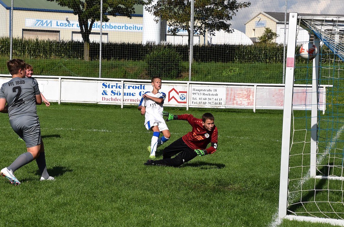 Den ersten zaghaften Gegenangriff des VfL Ebeleben verzeichneten wir in der 14. Minute. Dieser konnte jedoch vom aufmerksamen Oskar Weise im Zentrum der Wackerabwehr routiniert abgelaufen werden. Beim 0:2 in der 17. Minute reagierte Mieron John am schnellsten, als er einen vom Torwart abgewehrten Schuss von Cederic Ostmann im Tor unterbrachte. In der 18. und 26. Minute glückte Cederic zwei schön anzusehende Treffer. Zunächst schoss er aus halblinker Position zum 0:3 unter die Querlatte und dann gelang ihm nach Anspiel von Richard Schulze das 0:4 in den rechten oberen Torwinkel. Nach zwei weiteren Tormöglichkeiten, Henri König traf nur den rechten Außenpfosten und Richards Distanzschuss flog rechts am Tor vorbei, erzielte Richard Schulze in der 29. Minute aus gut 15 m Entfernung den 0:5 Halbzeitstand.