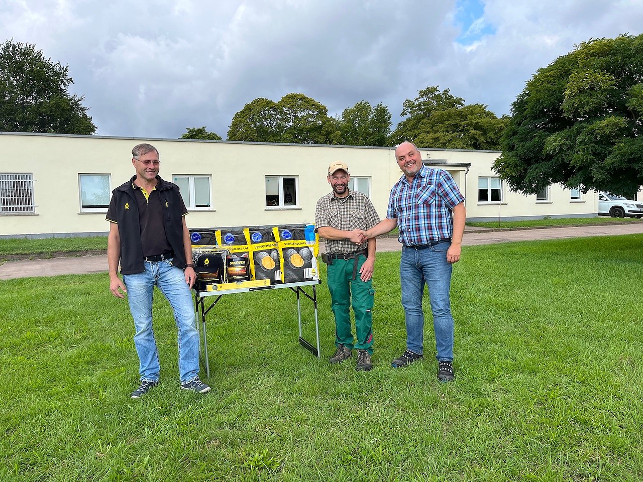 Gut geschätzt: Pierre Fromm (Mitte) gewinnt das Quiz um die Ertragszahlen (Foto: Südharzer Landhandel)