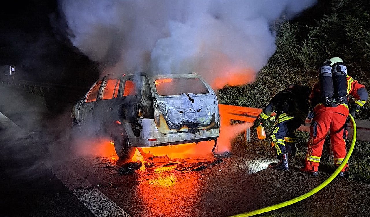 Er steuerte sein Fahrzeug noch auf den Standstreifen und konnte sich in Sicherheit bringen, bevor das Fahrzeug in Flammen aufging. Beim Eintreffen der Feuerwehr stand das Fahrzeug bereits im Vollbrand.