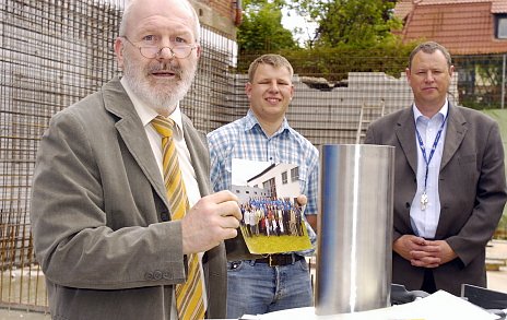 Die neue Filterhalle des künftigen Wasserwerkes steht zwar noch nicht, doch die Fundamente sind sichtbar und boten Platz für die Legung des Grundstein. Diesen Akt zelebrierte der Geschäftsführer des Wasserverbandes Nordhausen, Ulrich Schardt. Er legte – ganz nach altem Brauch – viele zeitgenössische Dokumente in die Schatulle, die dann in das Fundament eingelassen wurde: Den Euro als aktuelles Zahlungsmittel, einen Bauplan der Anlage, Prospekte und Visitenkarten der am Bau beteiligten Firmen sowie aktuell ausgedruckte Beiträge der nnz. Mit einem Hammerschlag wurde die Grundsteinlegung abgeschlossen.