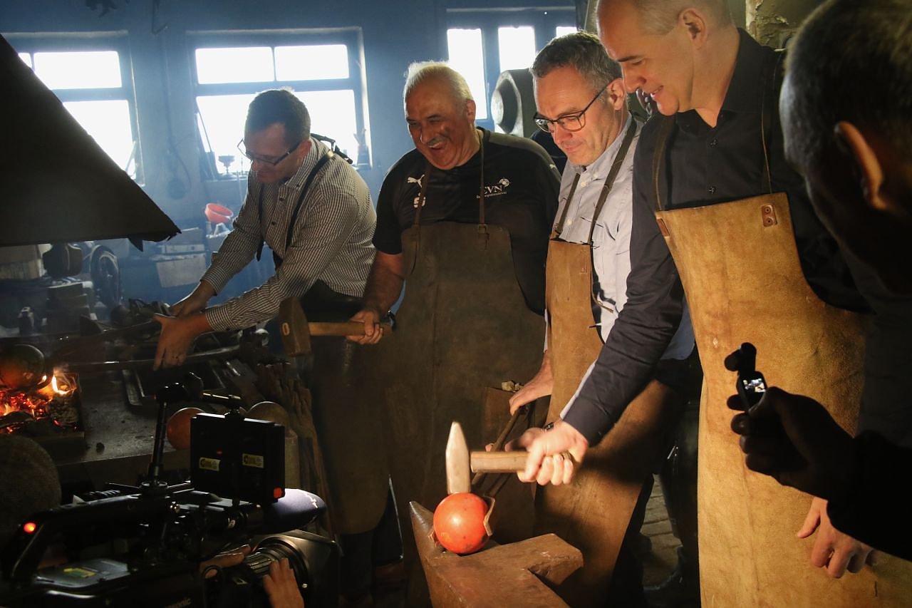 Wirklich geschmiedet werden mussten die Kugeln freilich nicht mehr, die Sportgeräte sind bis auf das Gramm genau abgewogene Präzisionsarbeiten, da kann auch ein Schmied in 4. Generation nichts mehr dran verbessern. Für ein paar schöne Bilder taugt die alte Werkstatt aber bestens und um Aufmerksamkeit soll es letztlich auch gehen.
