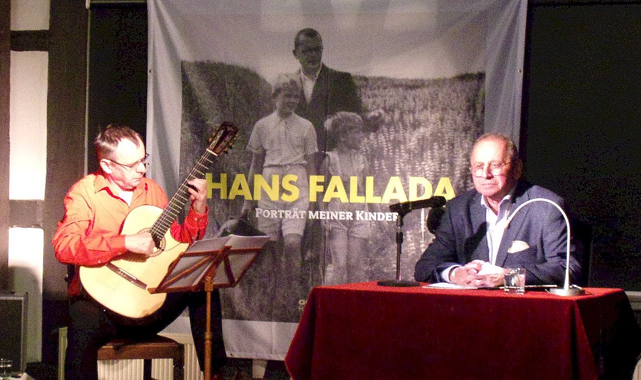 Doch Eichhorn ist nicht allein auf der Bühne. Ihm zur Seite steht – oder besser: musiziert – Frank Fröhlich. Er heißt nicht nur so, er ist es auch. Der beliebte Dresdner Gitarrist ist in zahlreichen europäischen Ländern kein Unbekannter. Falladas große Sammlung von Schellackplatten mit Volksmusik, Schlagern und Klassik inspiriert Fröhlich dazu, Fallada quasi zum Klingen zu bringen, ihm ein musikalisches Gesicht zu geben.