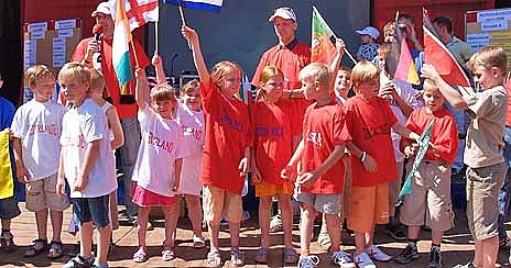 Die jungen Kicker konnten auf die Bühne kommen und sich den Gästen des Rolandsfestes selbst vorstellen. Sie erhielten ihre Staatsflagge und zwei Shirts vom jeweiligen nationalen Fußballverband. Und sie können sich gleich ihre Gruppengegner ansehen. Also dann junge Fußballer, auf geht’s zum Petersberg, die mini-WM beginnt.