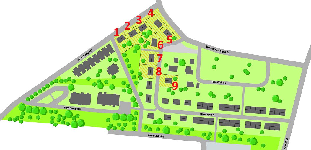 Die SWG Nordhausen startet noch vor Jahresende mit der Vermarktung von neun Baugrundstücken im Baugebiet Hanglandschaft Nordhausen-Nord. Die quadratischen Grundstücke sind zwischen 511 und 593 Quadratmetern groß. (Foto: Grafik: SWG Nordhausen/Enders Marketing)