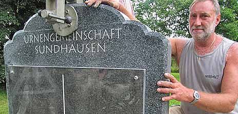 Ab Juli sind so genannte halbanonyme Bestattungen auf dem neu geschaffenen Urnenhain in Nordhausens Ortsteil Sundhausen möglich. Ein Fachbetrieb hat jetzt den Stein für den Urnenhain auf dem Friedhof aufgestellt (siehe Foto). Die Bestattung auf dem Urnenhain ähnelt - im Unterschied zu einer komplett anonymen Urnengemeinschaftsanlage - einer normalen Einzelgrabbeisetzung: Die Angehörigen können bei der Beisetzung dabei sein, erklärte Sabine Dautz, Sachgebietsleiterin Friedhöfe im städtischen Bauamt.